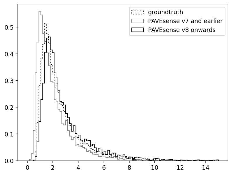 De distributie van eIRI voor verschillende versies van PaveSense afgebeeld naast referentie metingen.