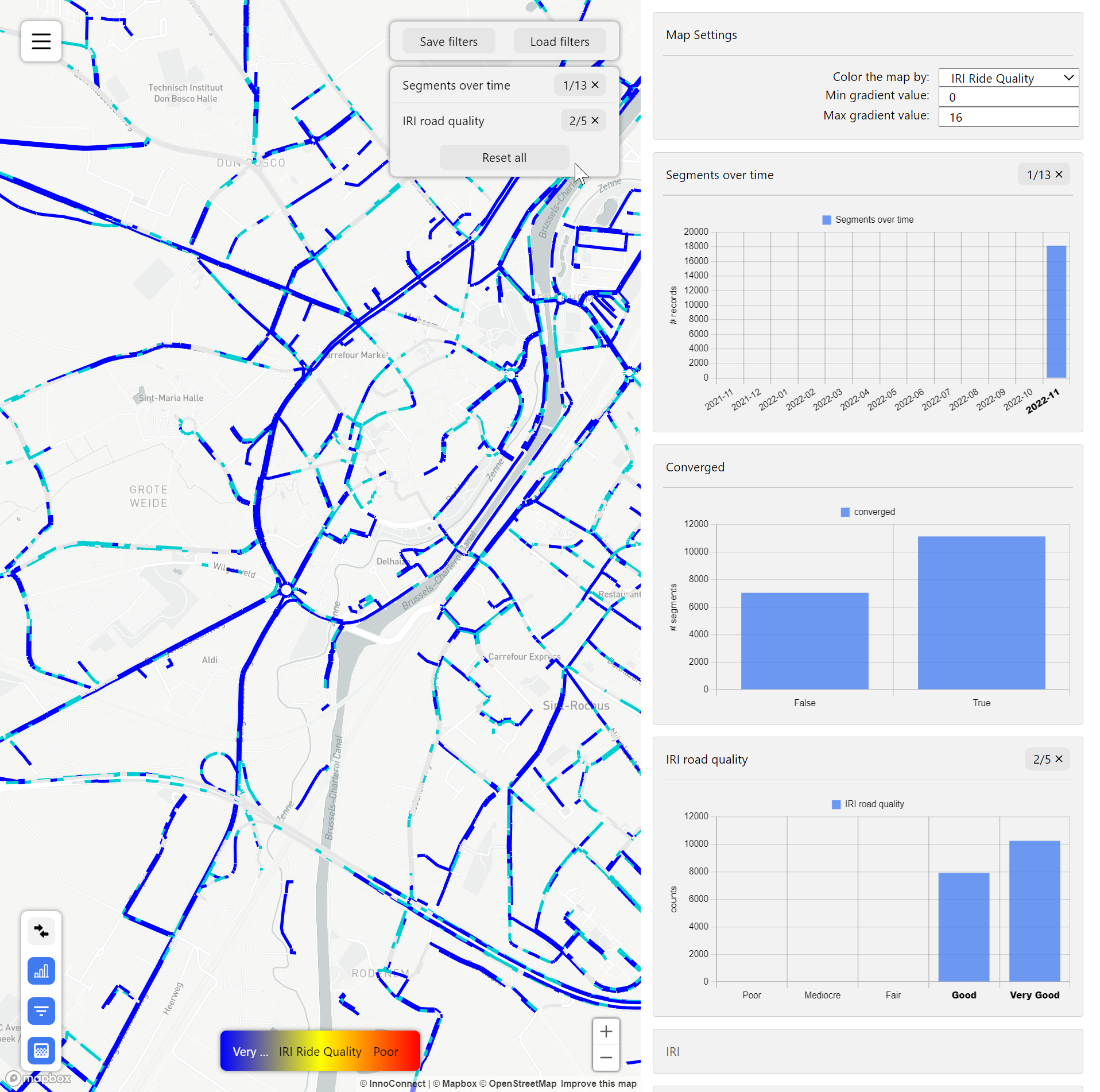 De data van Halle werd hierbij gefilterd op datum 2022-11 en IRI Ride Quality "Good" en "Very Good"