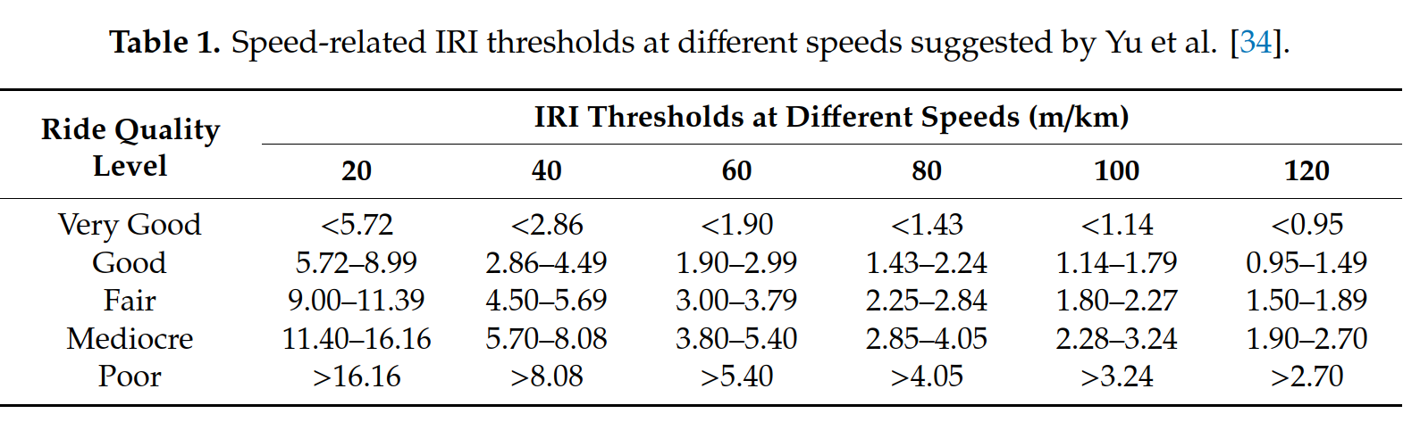 Speed-related IRI thresholds at different speeds suggested by Yu et al.